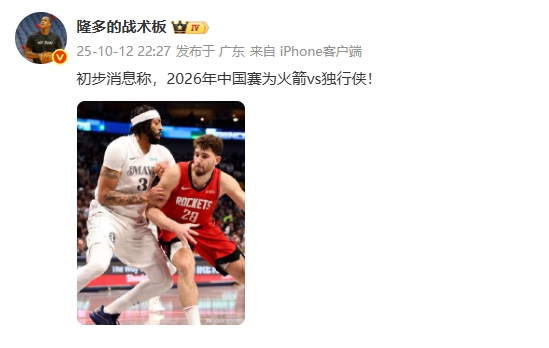 據(jù)博主@隆多的戰(zhàn)術(shù)板透露,初步消息稱,2026年中國賽為火箭vs獨(dú)行俠!