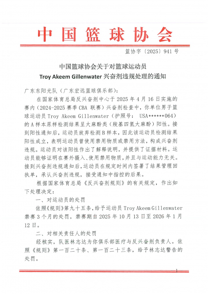 Troy Akeem Gillenwater 興奮劑違規(guī)處理的通知 廣東東陽光隊(廣東宏遠籃球俱樂部):