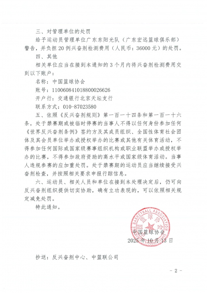 2025年10月13日抄送:反興奮劑中心、中籃聯(lián)公司