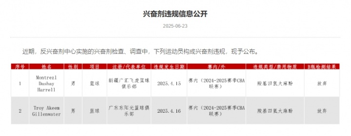 中國反興奮劑中心公示 哈雷爾&吉倫沃特賽季期間違規(guī)!