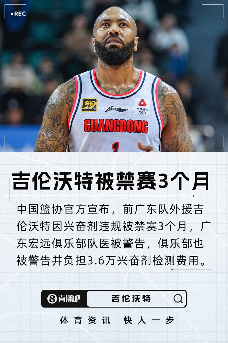 10月13日訊 中國籃協(xié)官方宣布,前廣東隊外援吉倫沃特因興奮劑違規(guī)被禁賽3個月,廣東宏遠俱樂部隊醫(yī)林志達被警告,俱樂部也被警告并負擔(dān)20例興奮劑檢測費用(36000人民幣)。