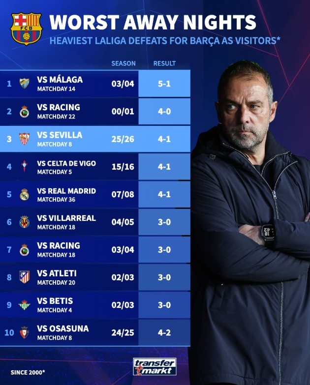 10月7日訊 巴薩本輪聯(lián)賽客場1-4不敵塞維利亞,德轉(zhuǎn)統(tǒng)計了巴薩本世紀西甲客場輸球紀錄,他們曾1-5不敵馬拉加,3次1-4輸球。