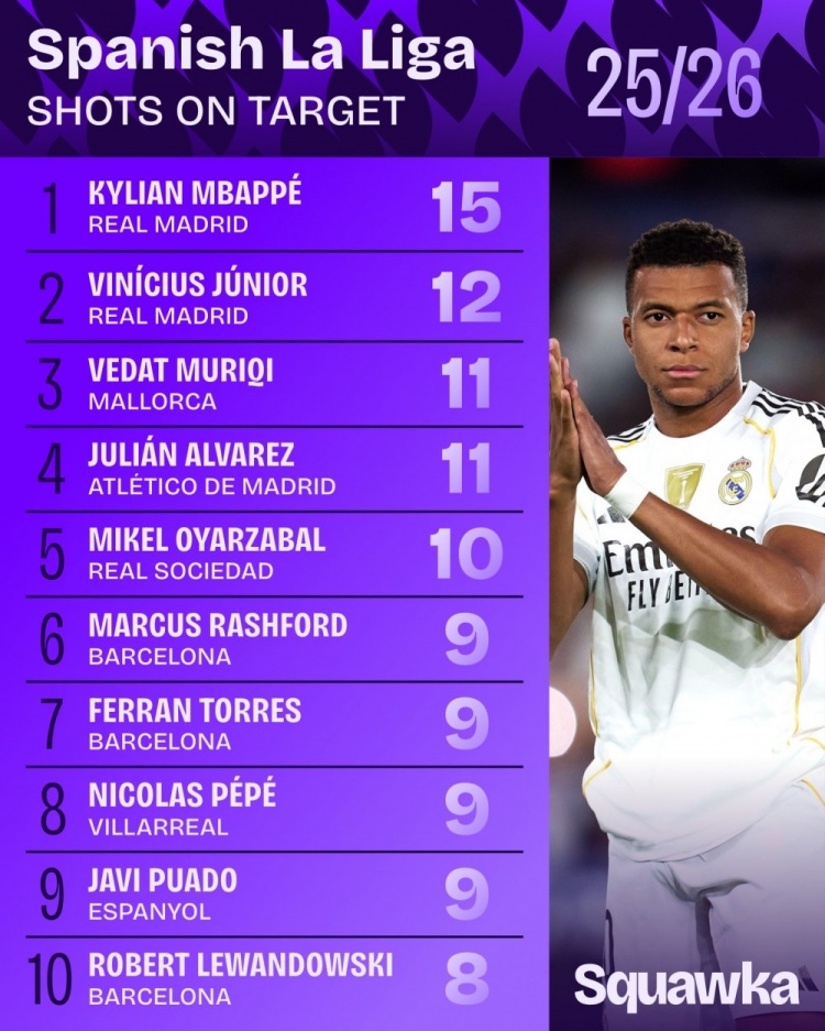 10月7日訊 日前,Squawka統(tǒng)計了本賽季西甲射正次數(shù)排行,姆巴佩15次居首。