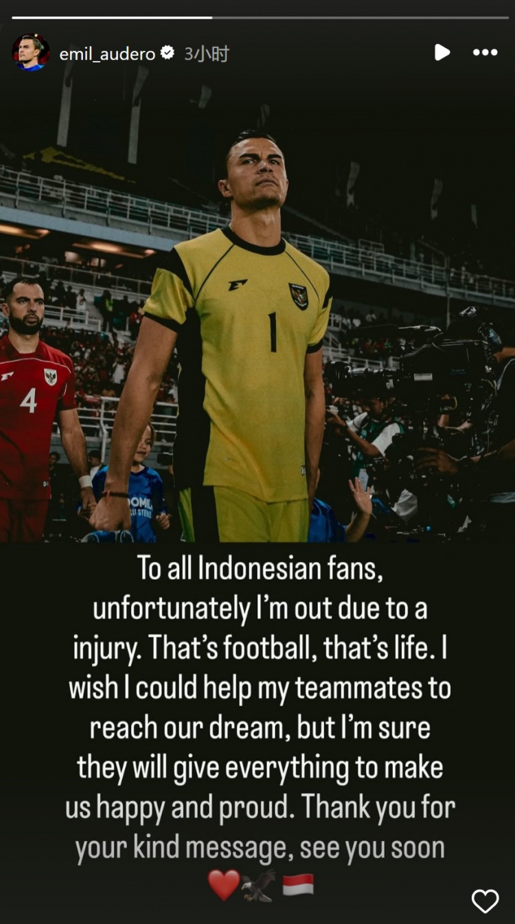 10月7日訊 印尼隊門將奧代羅更新社媒動態(tài),宣布自己因傷退出本期國家隊名單。
