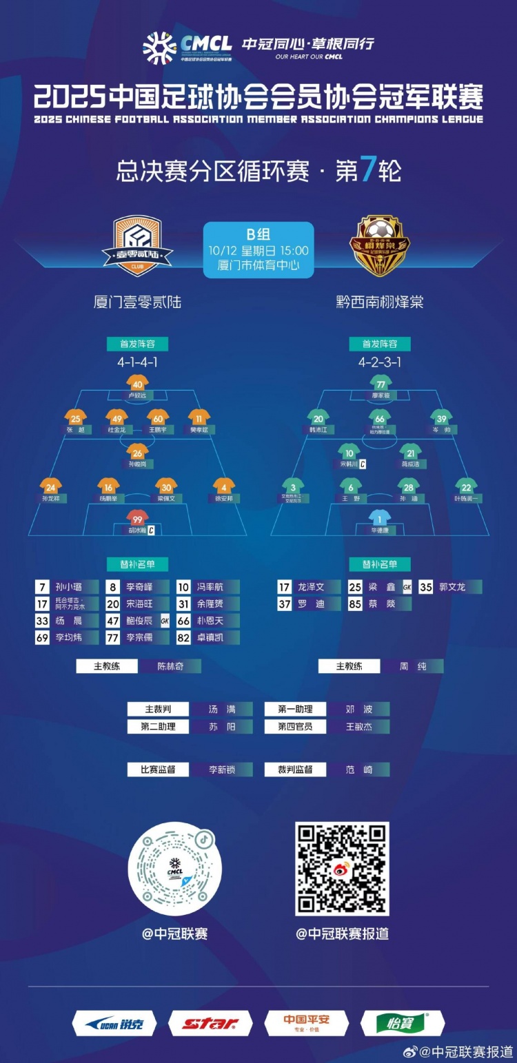 廈門壹零貳陸替補(bǔ)陣容:7-孫小璐、8-李奇峰、10-馮率航、17-阿不力克木、20-宋海旺、31-余隆赟、33-楊晨、47-鮑俊辰、66-樸恩天、69-李均煒、77-李宗儒、82-卓鎮(zhèn)凱