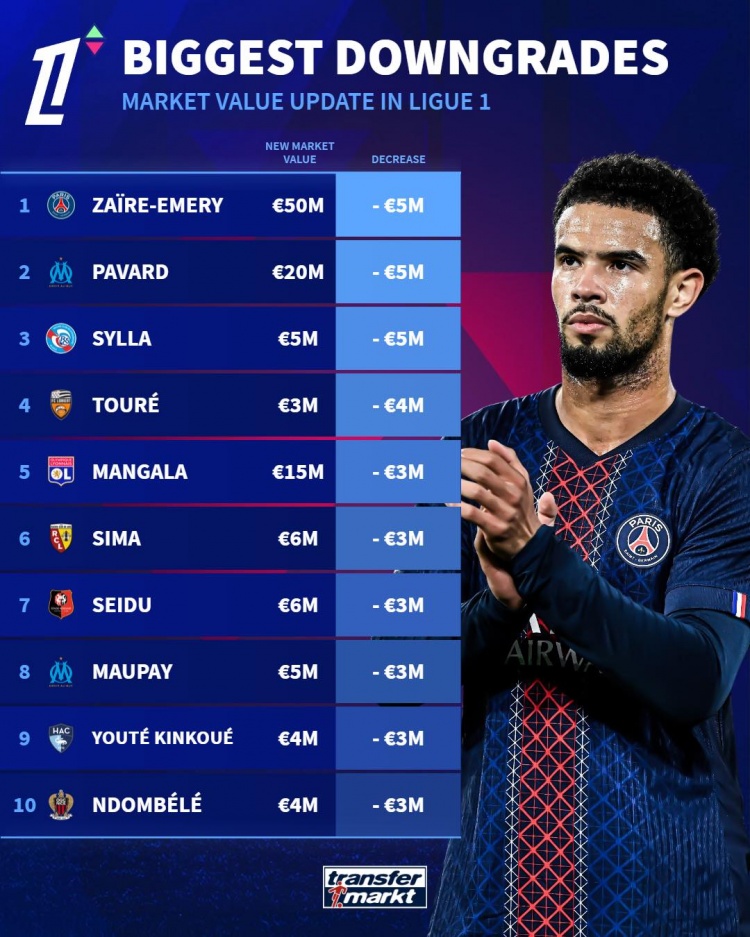 10月12日訊 德國轉(zhuǎn)會(huì)市場(chǎng)更新了法甲球員的身價(jià),并列出身價(jià)下跌排名,扎伊爾-埃梅里、帕瓦爾、西拉-500萬歐居首。