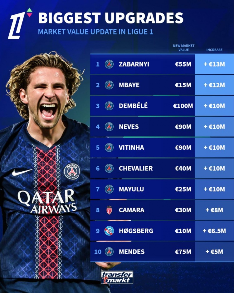 10月12日訊 德國轉(zhuǎn)會市場更新法甲球員的身價,并列出身價上漲榜單,扎巴爾尼+1300萬歐居首,巴黎球員占據(jù)前7名。